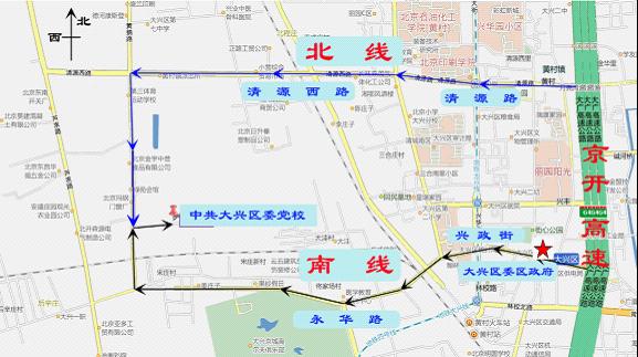 南线:区政府→黄村兴政街西行→黄村宋庄村西口红绿灯北行700米→党校路牌指向